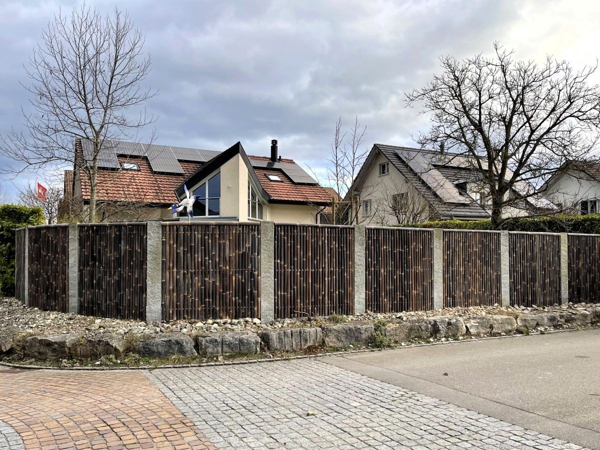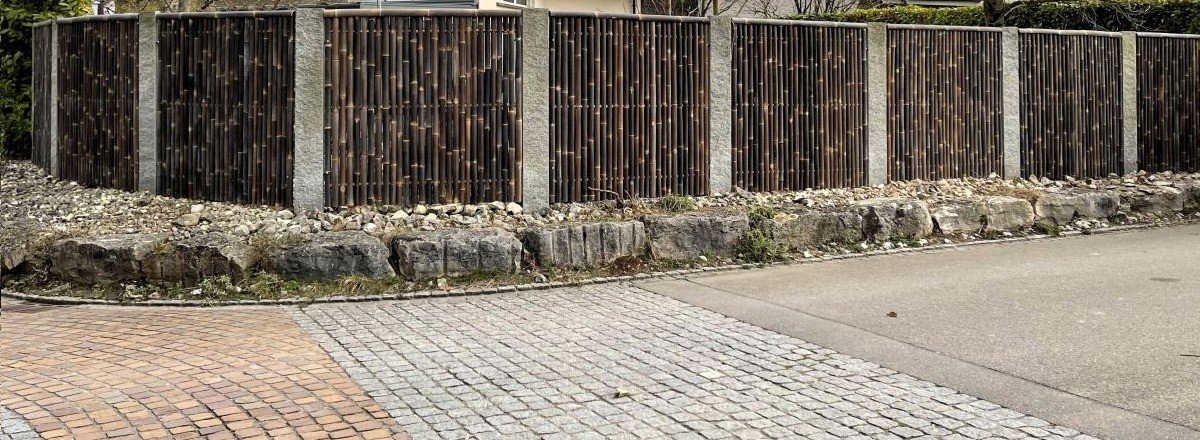 Eine Vielzahl an Gestaltungsmöglichkeiten bietet sich mit den unterschiedlichsten und massiven Naturstein Palisaden, hier in Kombination mit der Bambuszaun Elementwand BALINES in dunkelbrauner Ausführung mit den dicken Bambusstangen. Auch erhältlich mit hellbraunem Bambus.