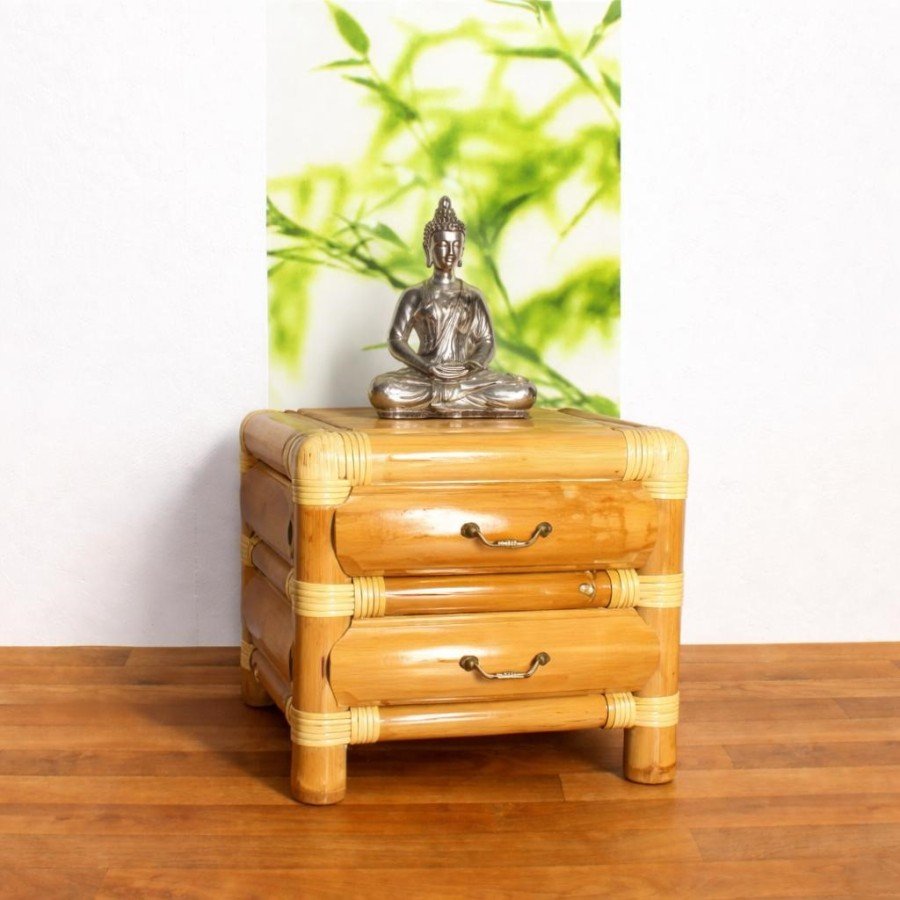 Damit im Schlafzimmer alles seinen Platz findet, dafür sorgen unsere Bambus Beistelltische. Die Bambus Nachttische gibt es in verschiedenen Ausführungen mit 1 bis 2 Schubladen oder ganz luftig, ohne Schublade. Doch nicht nur aus praktischer Sicht überzeugen unsere Bambus Nachttische. Mit der Bambus typischen und sichtbaren Maserung in naturbelassenem hellen, dunklen oder gefleckten Bambus und der kontrastreichen Glanz- Veriegelung erhalten Sie ein einzigartig von Hand gefertigtes Möbelstück aus Bambus.
